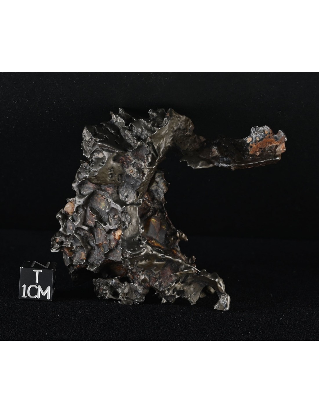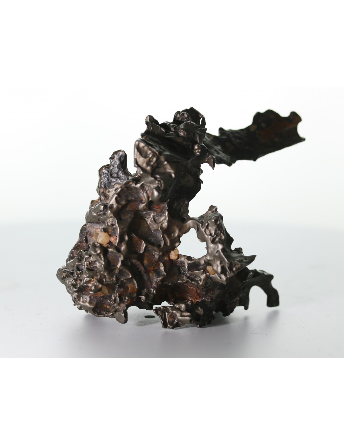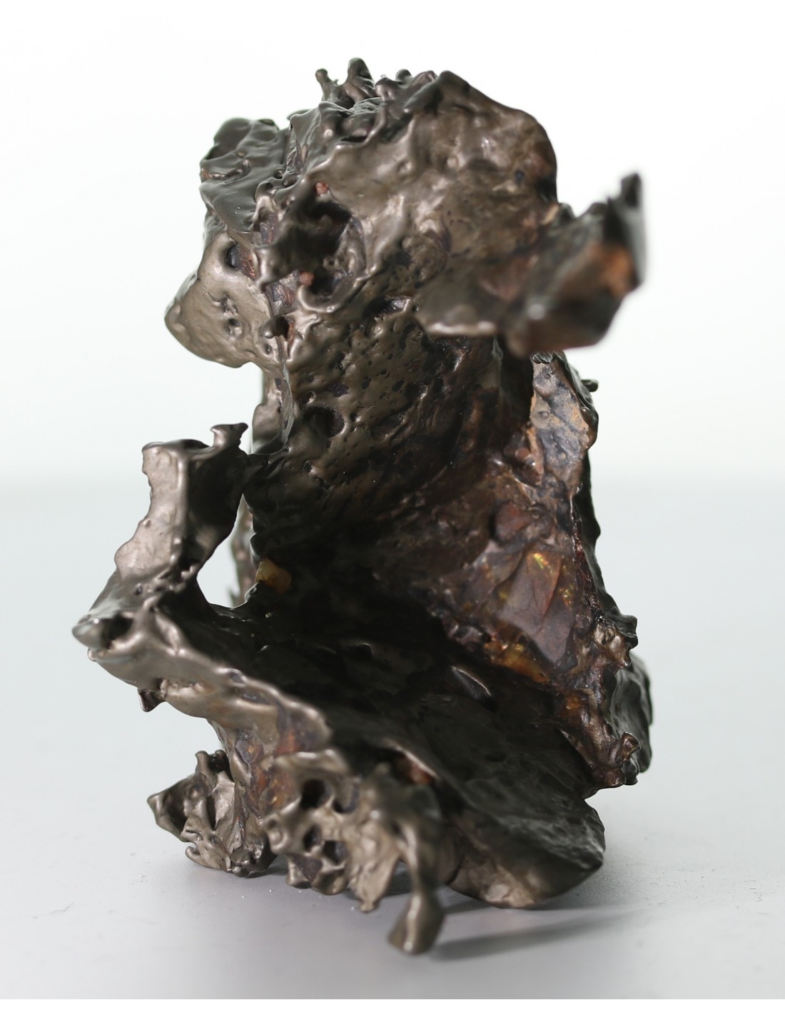 Only a few dozen specimens from this find are known, and among them, only a very limited number display such highly unusual and sculptural forms. The remarkable morphology of this piece is not accidental but the result of prolonged natural sandblasting. In a region characterized by persistent winds and abrasive desert sands, the meteorite was slowly shaped over time. The olivine crystals, being mechanically softer than the surrounding metal, were preferentially abraded, while the metal matrix resisted erosion more effectively. This differential erosion produced a unique relief and an organic, almost architectural surface.