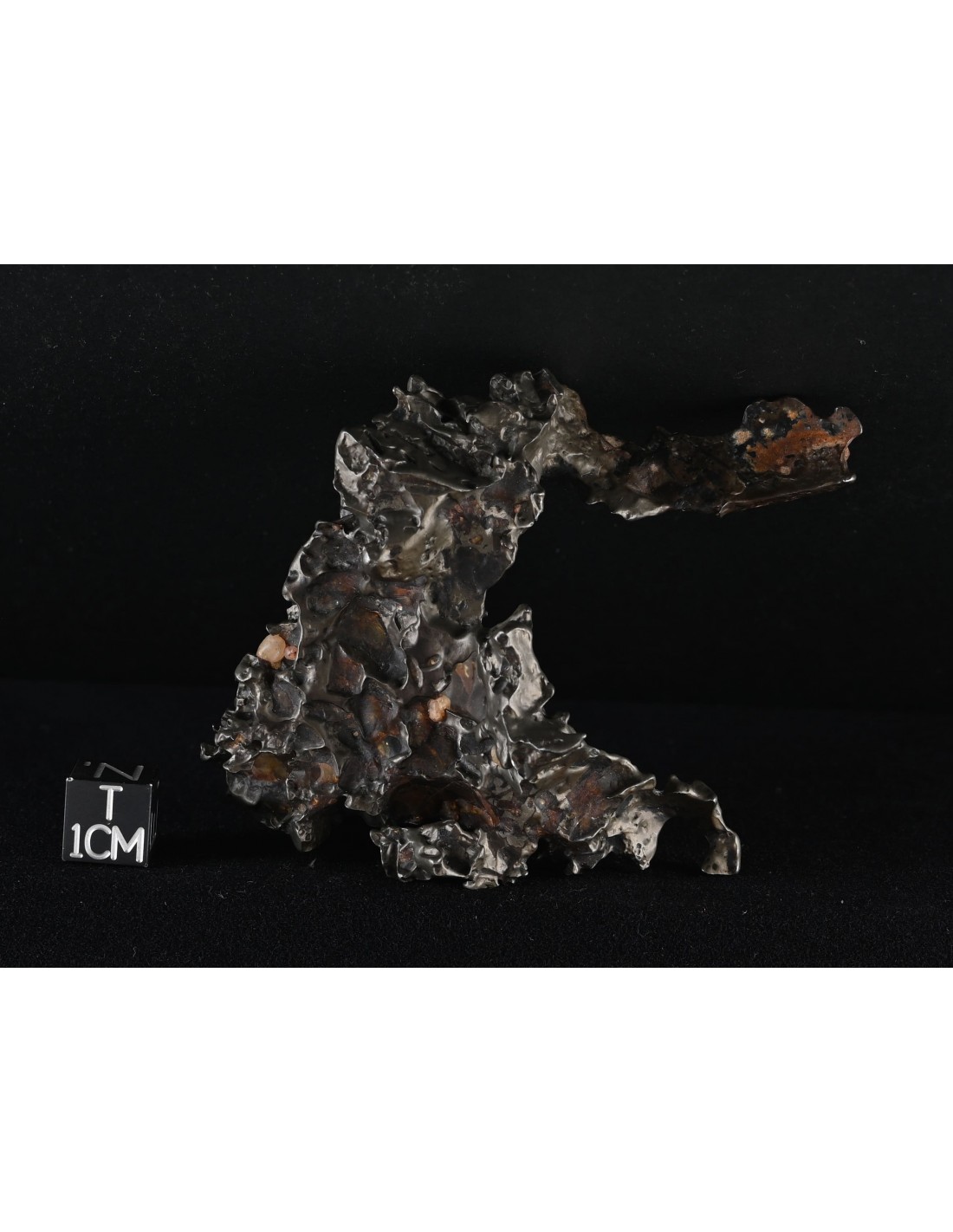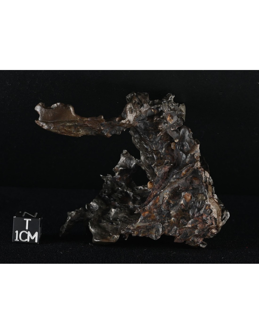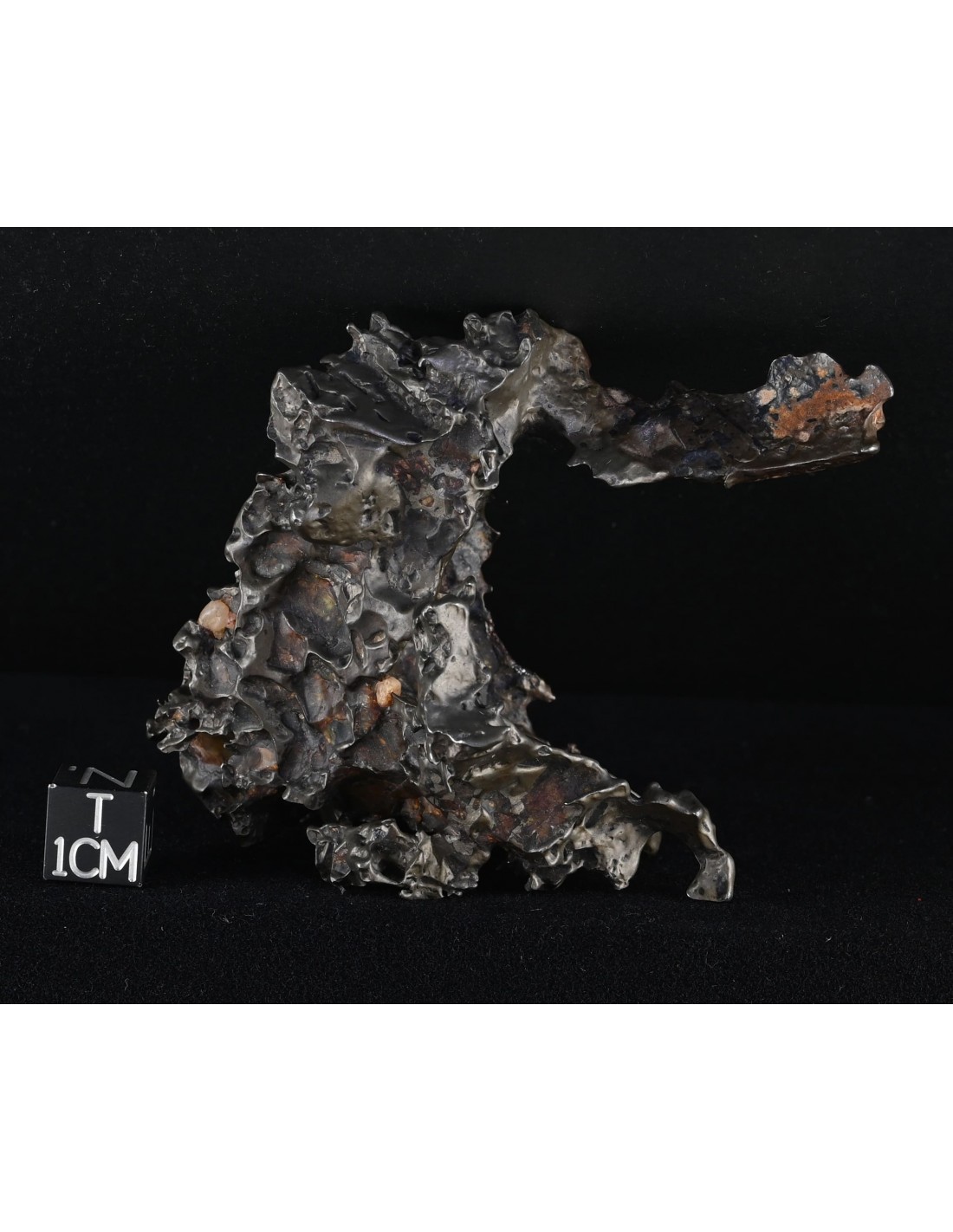 Only a few dozen specimens from this find are known, and among them, only a very limited number display such highly unusual and sculptural forms. The remarkable morphology of this piece is not accidental but the result of prolonged natural sandblasting. In a region characterized by persistent winds and abrasive desert sands, the meteorite was slowly shaped over time. The olivine crystals, being mechanically softer than the surrounding metal, were preferentially abraded, while the metal matrix resisted erosion more effectively. This differential erosion produced a unique relief and an organic, almost architectural surface.