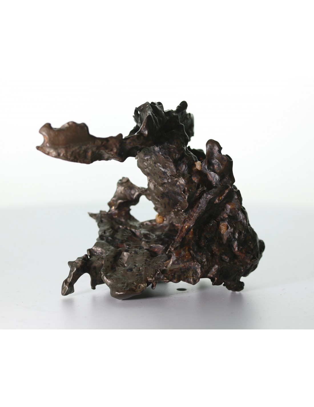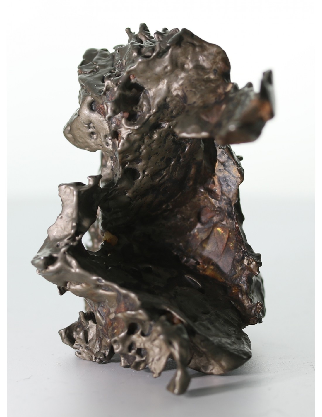 Golden Pallasite – 146.30 g - Sculpted Desert FormPallasite specimen displaying an extraordinary naturally sculpted shape and a distinctive bronze-golden patina on its metal surface. Known as a “Golden Pallasite” for its appearance under the Saharan sun, this specimen is the result of long-term natural sandblasting in an extreme desert environment.