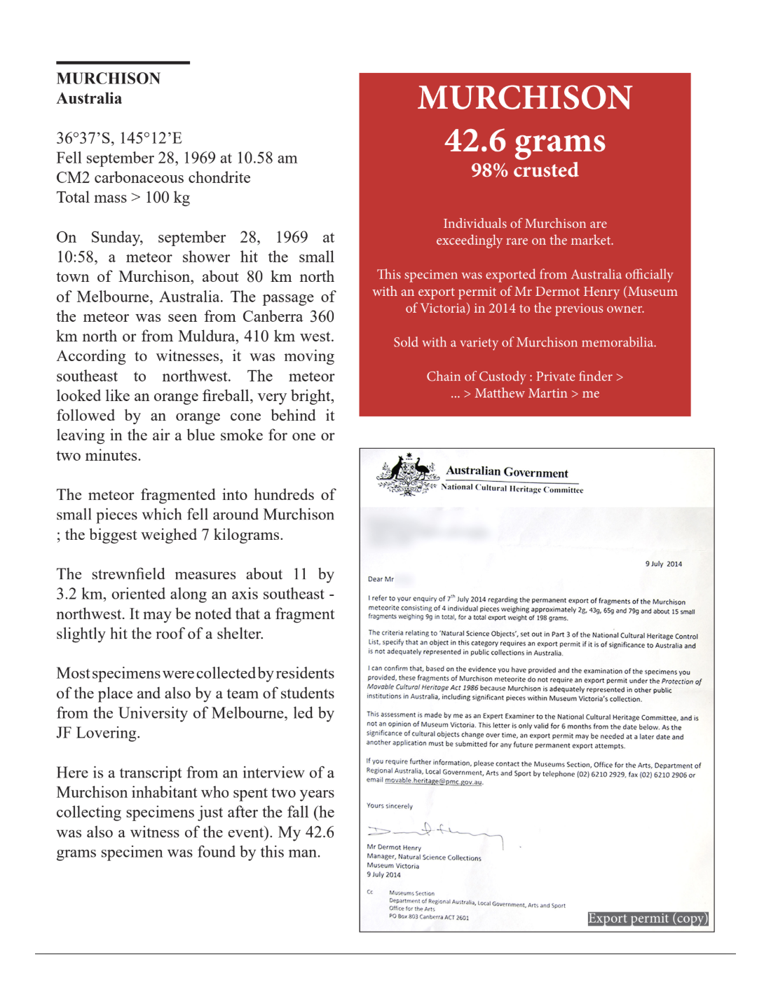 This specimen was officially exported from Australia in 2014 with an export permit issued through Mr. Dermot Henry (Museum of Victoria) to the previous owner. This documented export history is of particular importance, as Australian meteorites are subject to strict cultural and scientific heritage regulations.