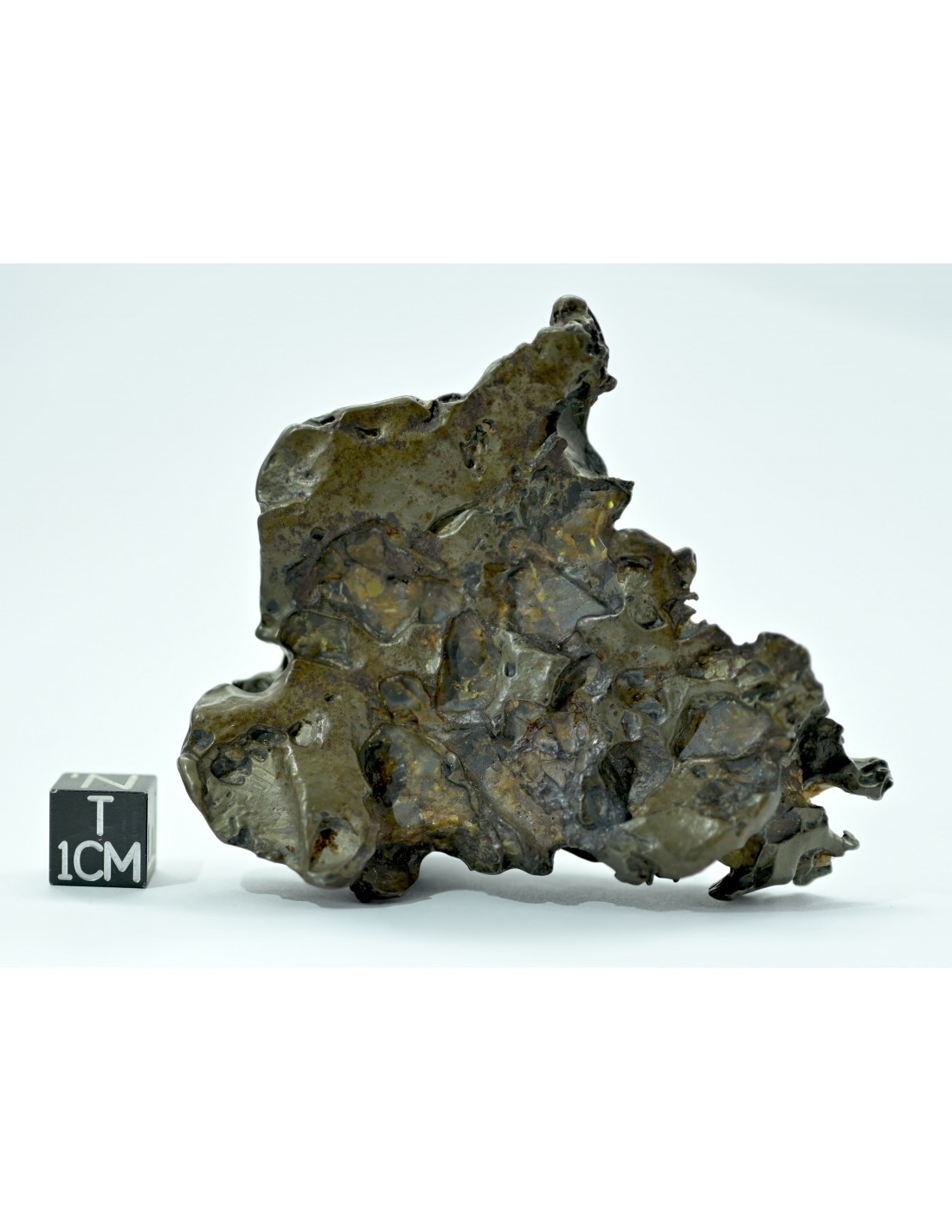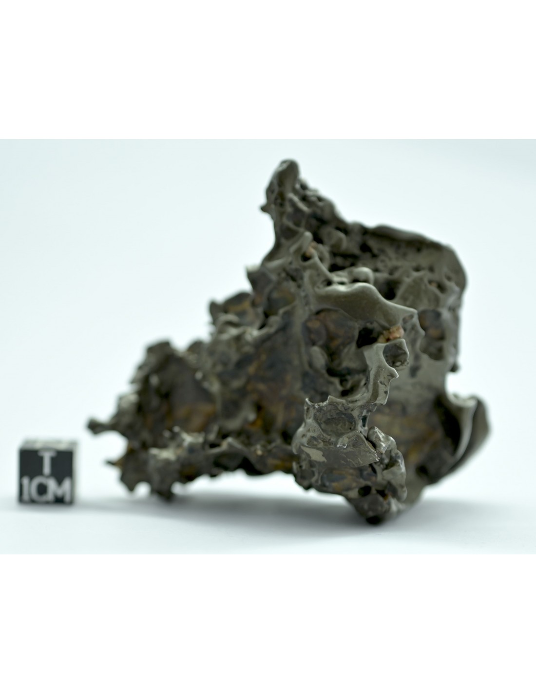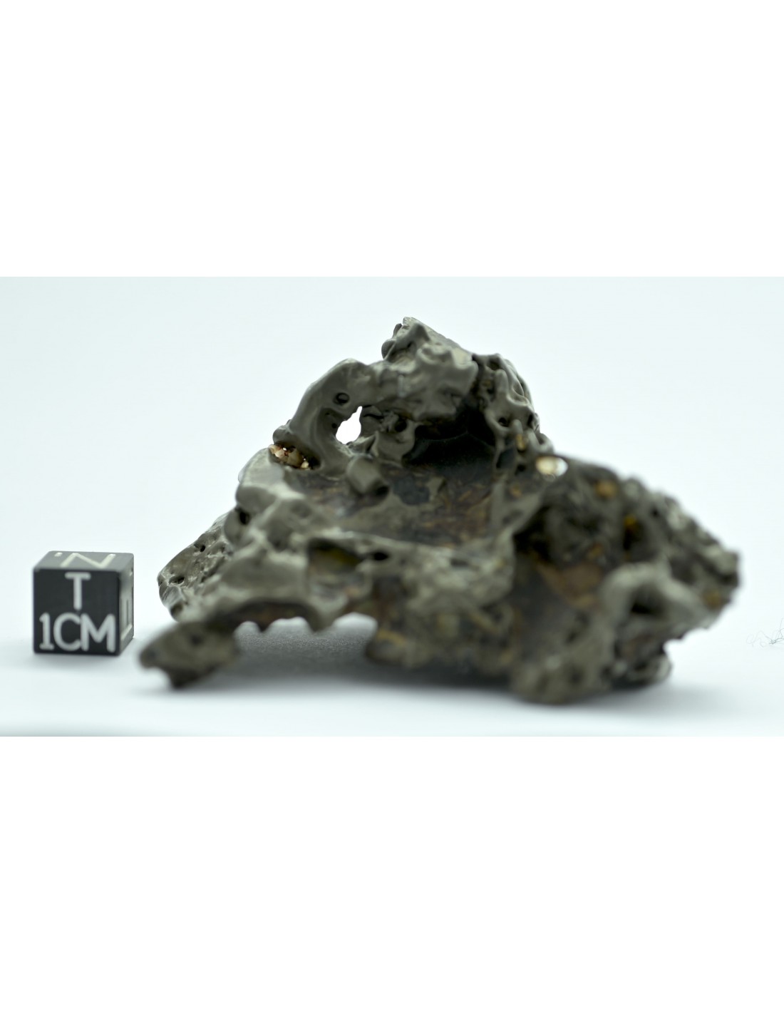 Unlike more compact specimens, this piece reveals a network of cavities and natural perforations, creating an almost architectural form. These voids are the result of prolonged desert weathering, during which the more fragile olivine crystals were progressively removed, leaving behind a resistant metallic framework.