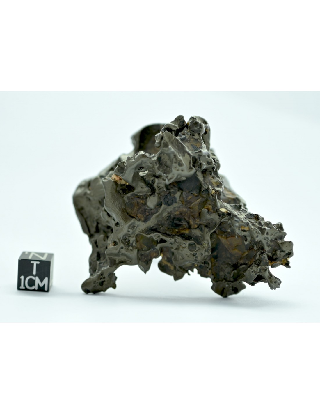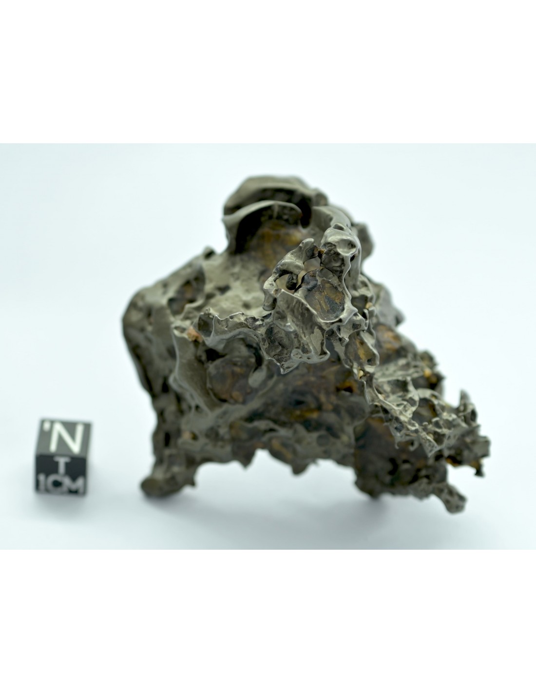 This framework now appears as a series of bridges, edges, and overhangs, giving the specimen a dynamic and highly sculptural character. The surface is marked by numerous metallic spikes, formed where the iron-nickel matrix resisted erosion. These sharp protrusions emphasize the internal structure of the meteorite and provide a tactile, almost organic texture.