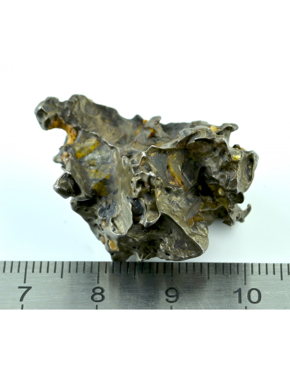 The specimen reveals a natural hollowed zone, where several olivine fragments remain preserved. These crystals, showing warm tones from yellow to amber, are partially embedded within the iron-nickel matrix and can be observed in depth, offering a glimpse into the original pallasitic structure.