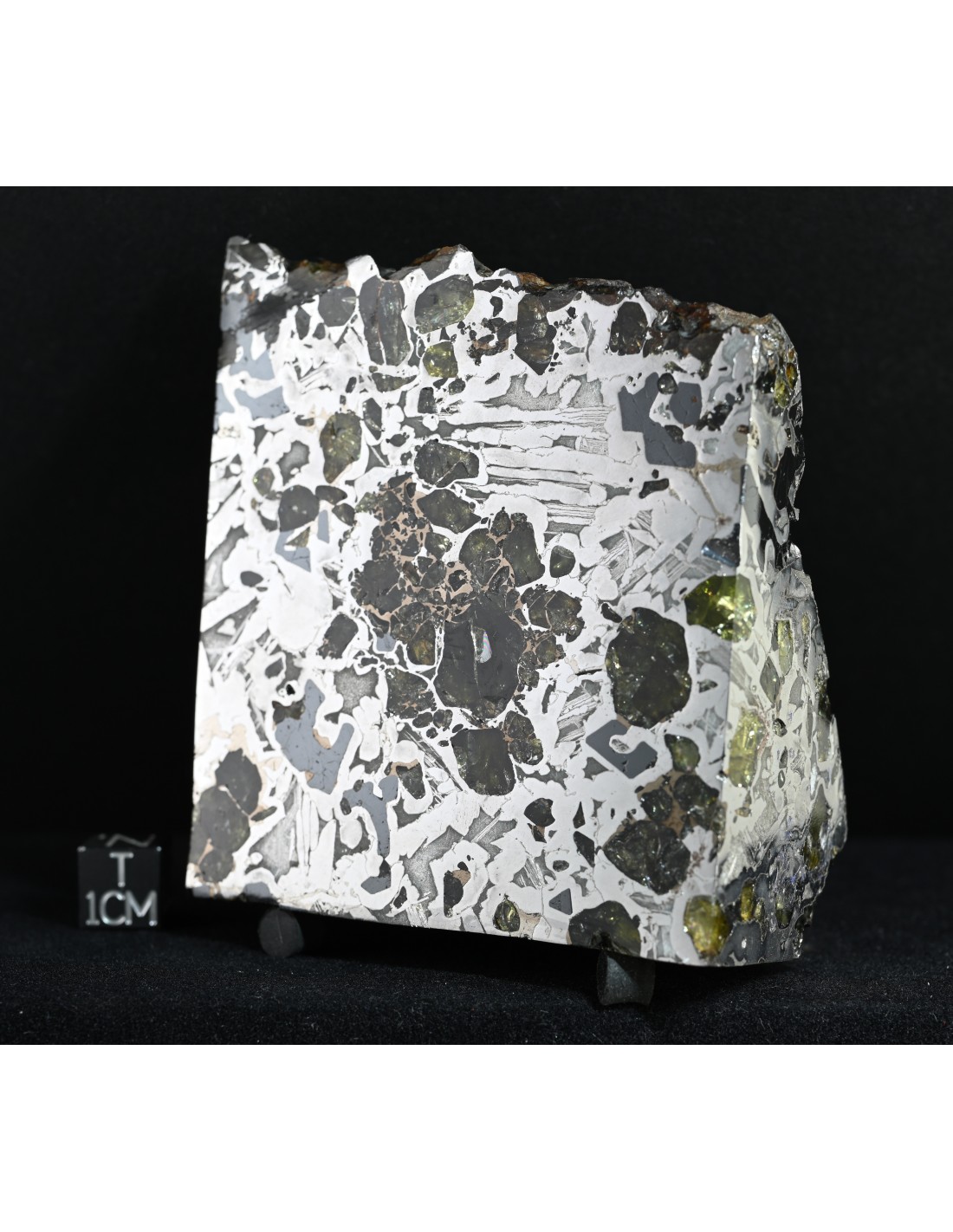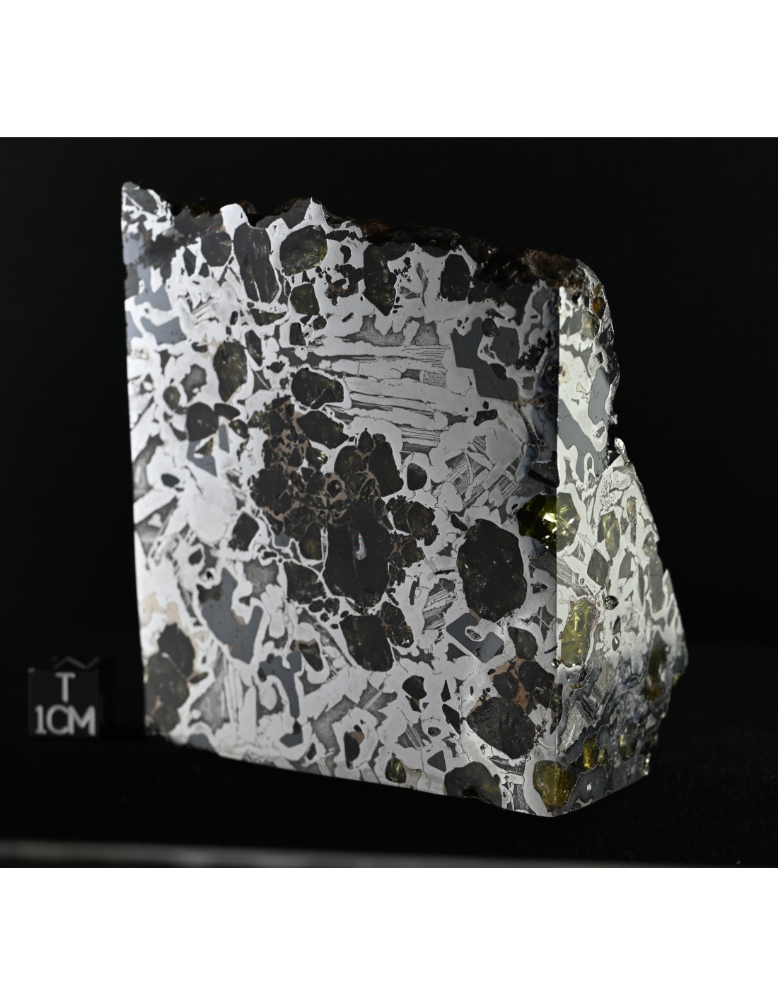 This makes it especially appealing to collectors looking for a Seymchan specimen with stronger presence and individuality than a classic slice. The geometry of the piece, combined with the visible olivines and contrasting metallic zones, creates a striking object that changes in expression depending on the viewing angle.
