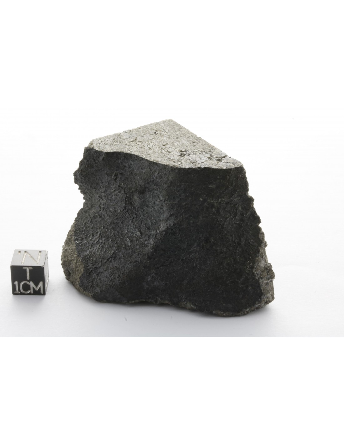 This specimen is presented as a talon (end cut), intentionally preserving a portion of the original fusion crust alongside a freshly exposed interior surface. The cut face reveals a fine-grained basaltic texture typical of Zagami, offering direct insight into Martian volcanic processes. The contrast between the dark fusion crust and the lighter interior emphasizes the meteorite’s atmospheric entry and extraterrestrial origin.